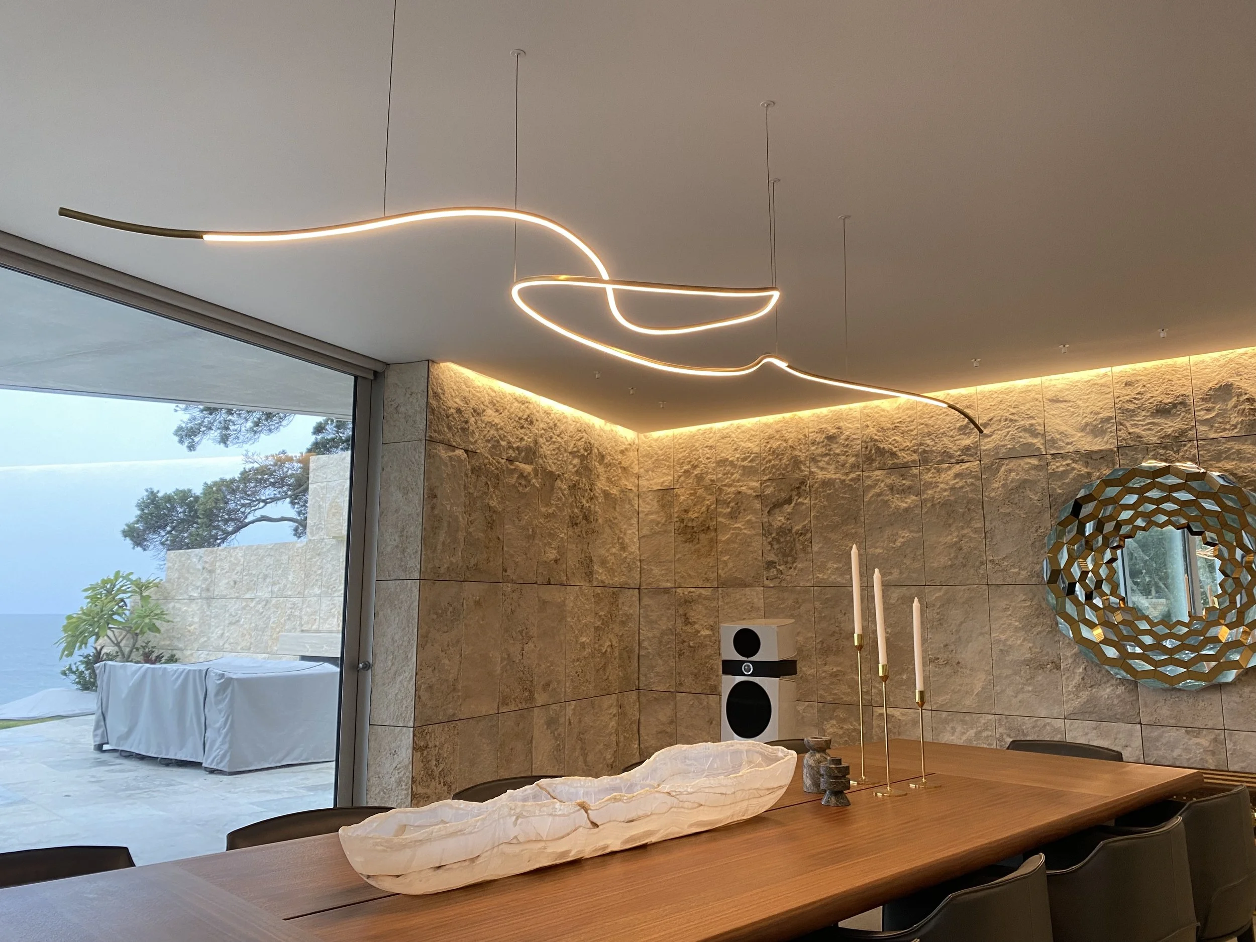 Crafted from a brass tube and shaped over several days, the LED is concealed within a groove cut along the tube, featuring an opal diffuser. It is then aged and finished with beeswax. The overall design can be customised to fit your space.