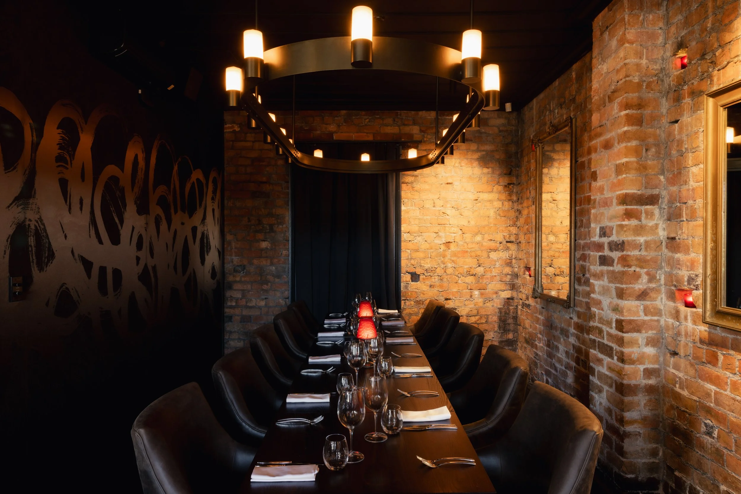 With high ceilings, rich flooring, and exposed brick, the large-scale candelabras fit seamlessly into the space. Soft, warm light emanates from the candles onto the diners below, and each pendant is custom-sized to fit the dining areas. The new bar lighting brings a fresh look to the long bar area downstairs, adding a warm glow for the patrons below
