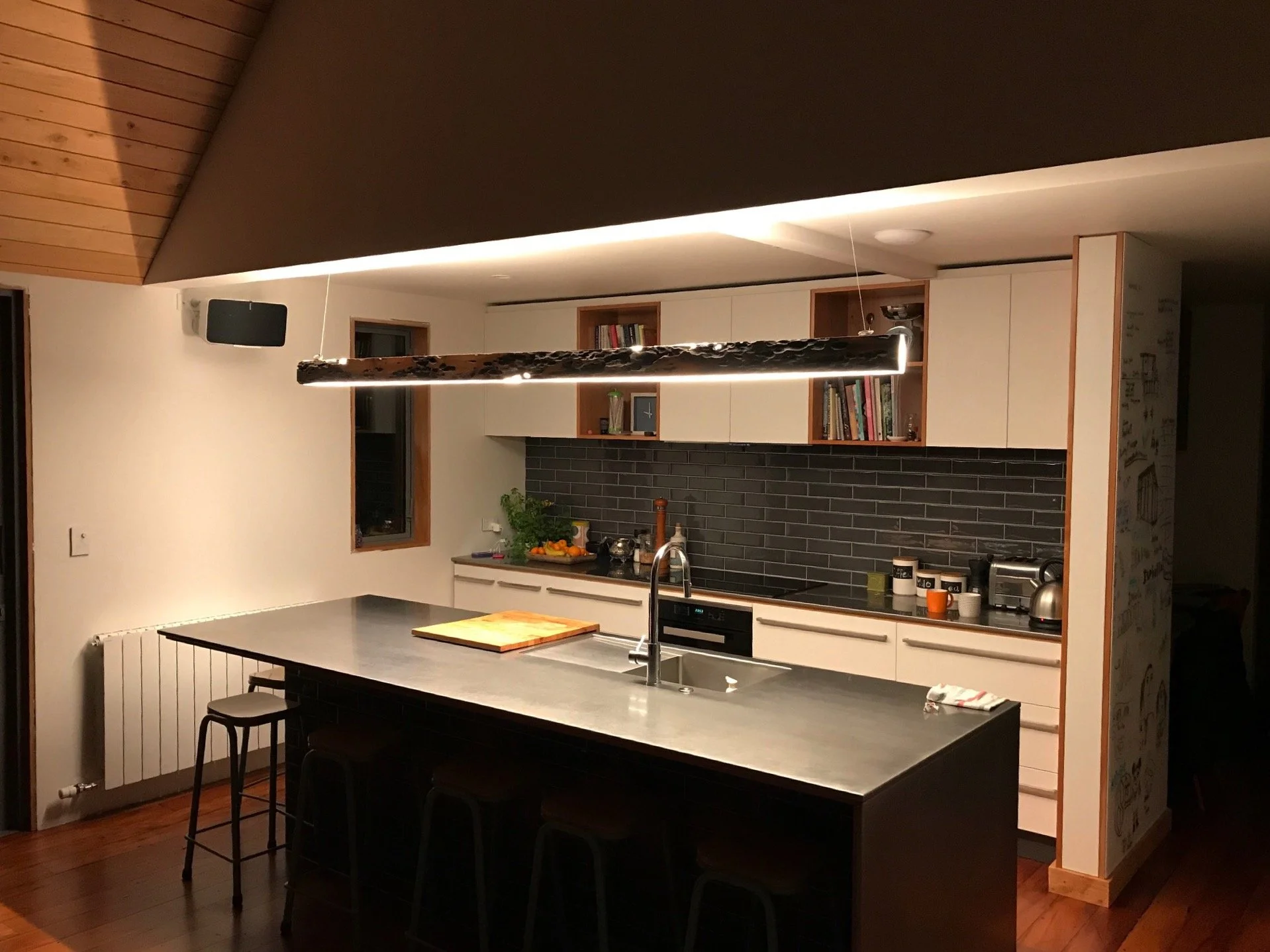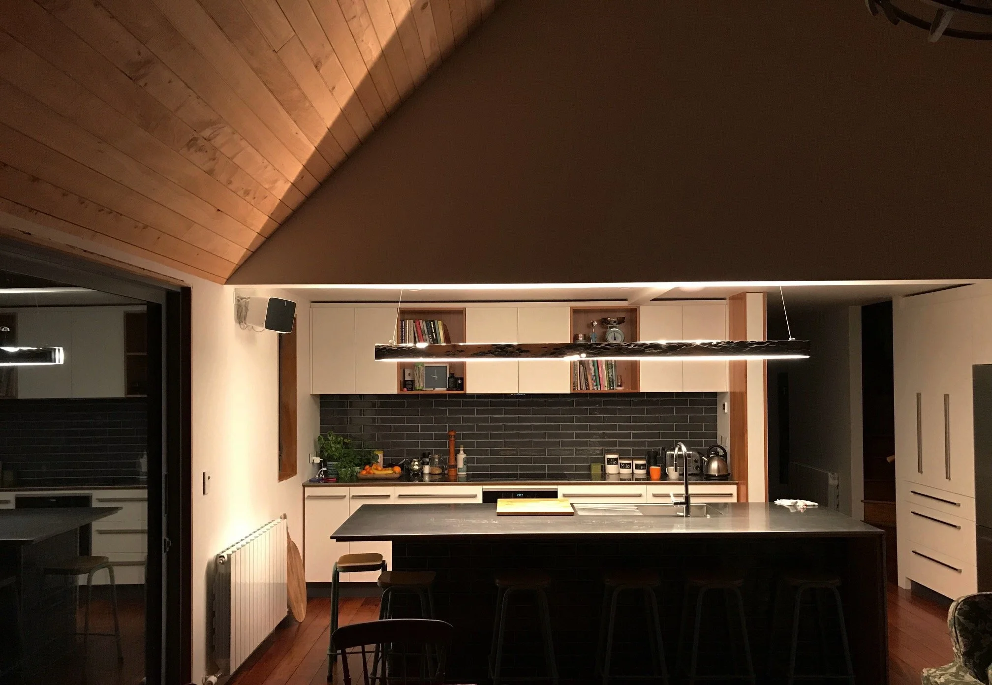 In early 2017, the inaugural series of the Portland collection traveled to Wellington, New Zealand. Designed with a strong emphasis on functionality, the Portland Wharf pendant utilised CRI LED technology to efficiently illuminate the kitchen area with precise task lighting, enhancing both style and utility. Complementing this piece, the Atomic Sphere provided a soft, ambient glow at the heart of the living space. These innovative lights introduced a fresh and captivating aesthetic dimension within the contemporary confines of this home, designed by Melling Architects.