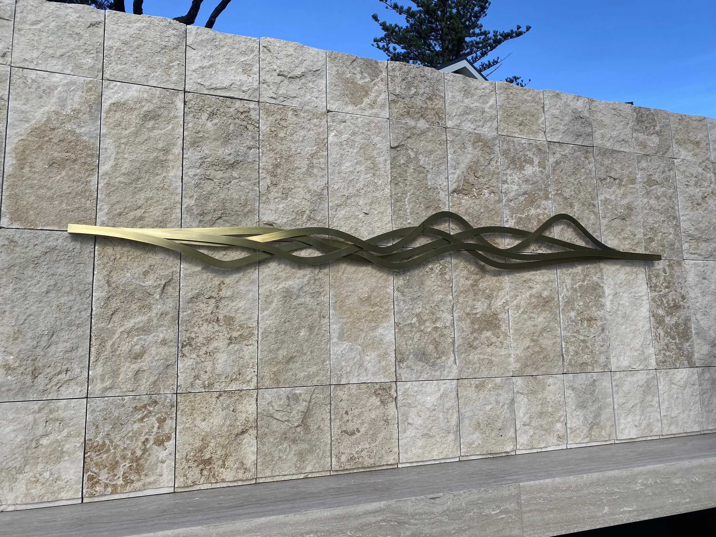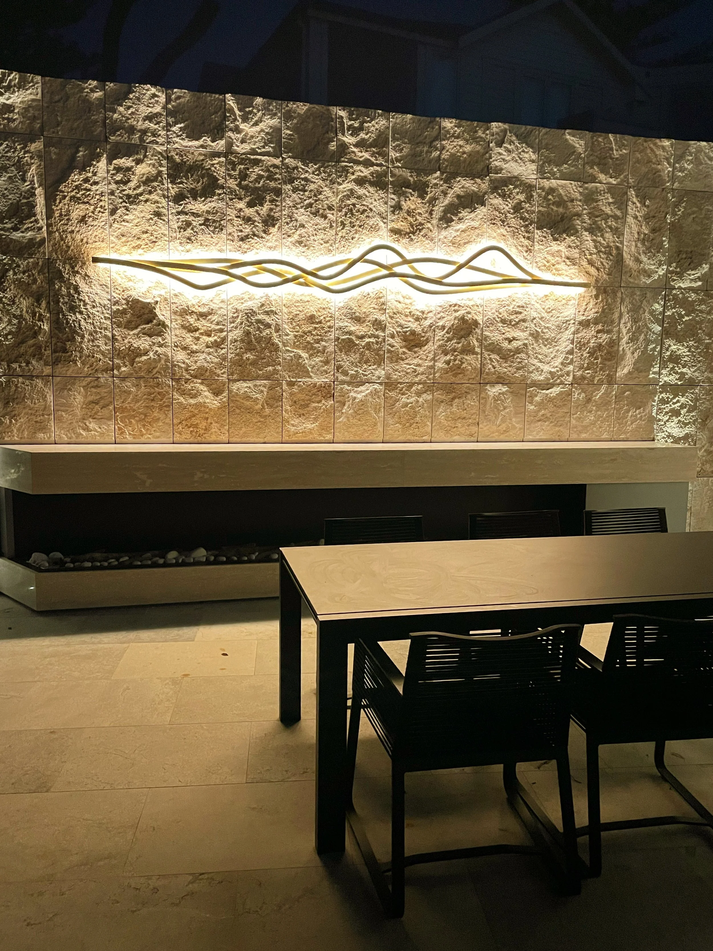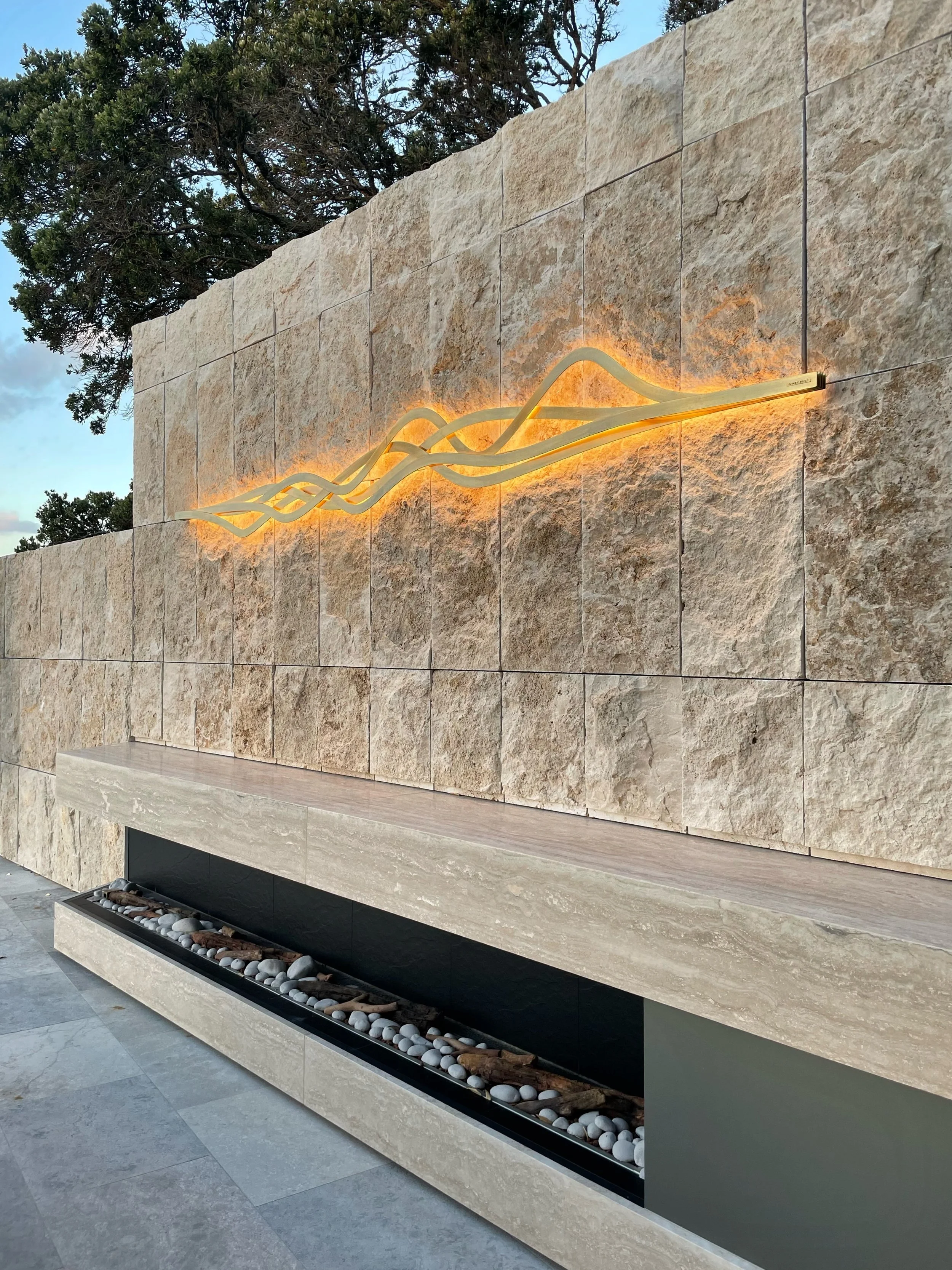 Phase is a member of the Hei Matau family of lights. It is a wall sculpture elegantly mounted on a large wall of exquisite travertine stone.