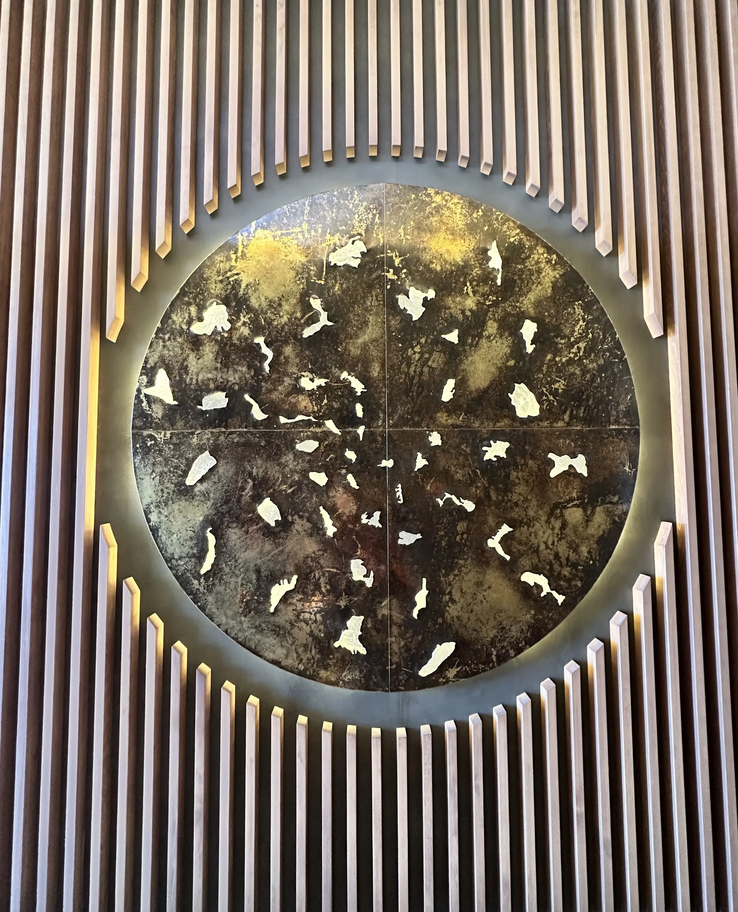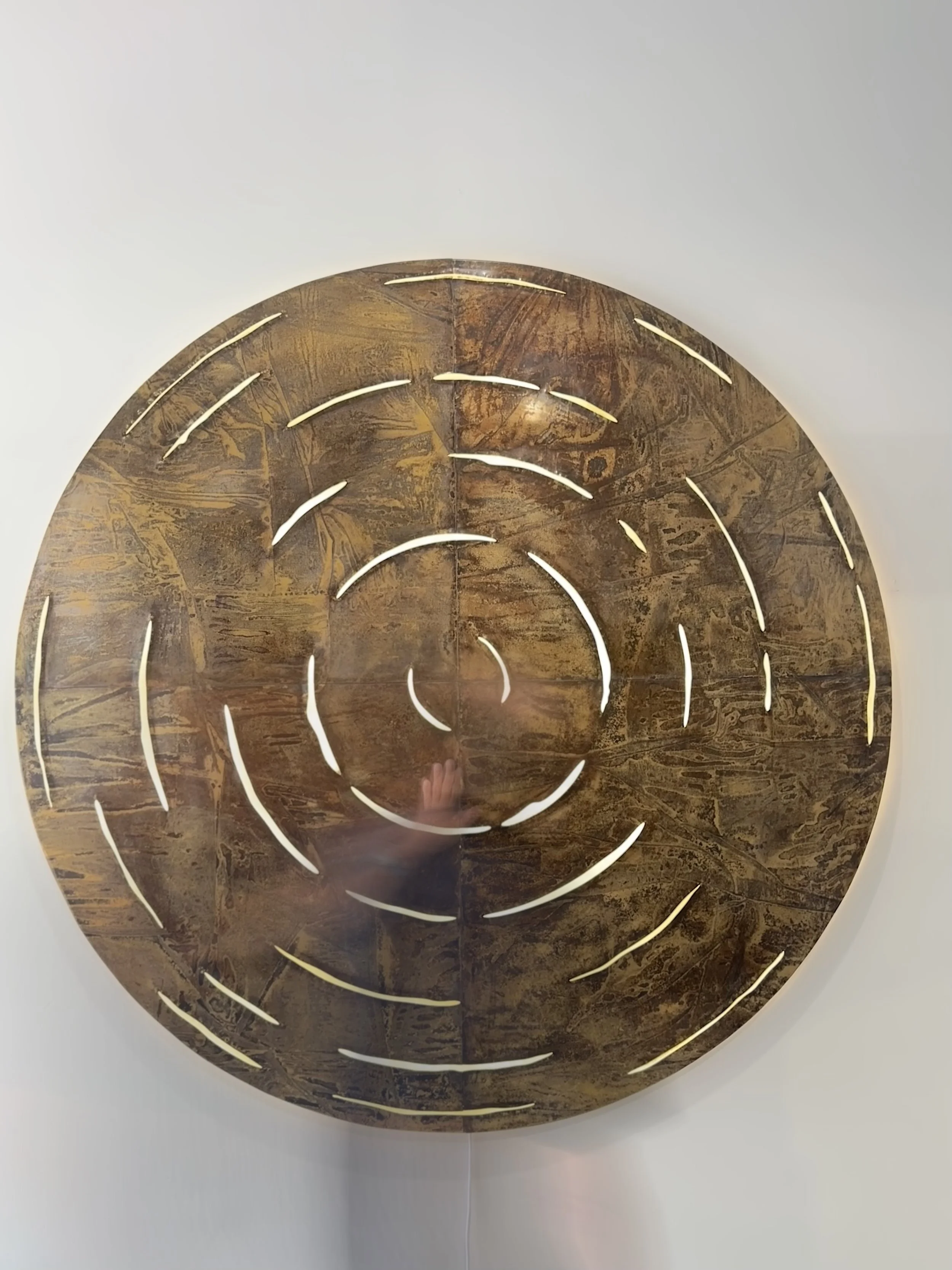 Wairua stands proudly as a large luxury wall sculpture with a diameter of 1.8 meters. Composed of beaten brass and textured cast glass, it symbolises the diverse places and bodies of water that have shaped James's identity. The interplay of light through the perforations accentuates the significance of these special spaces in James's personal narrative.